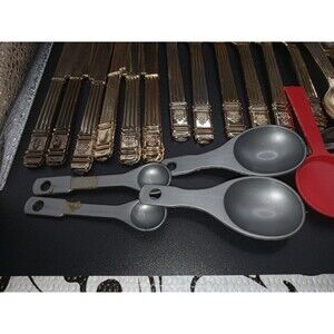 This is a huge lot of over 50 children's spoons, forks and knives made of both plastic and metal material. The set includes Chilton and other brands. These items are perfect for children's kitchen sets and come in a vintage style. They have been well-maintained and are in excellent shape. This lot is a great addition to any child's kitchen playset or for use in crafting projects.