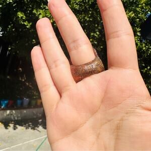 A powerful, one-of-a-kind creation by artisan Pitango Trotoush, this mixed-metal copper and turquoise ring is a sculptural masterpiece. The open-face design features bold turquoise inlay with radiant copper tones. It’s more than jewelry—it’s wearable art.