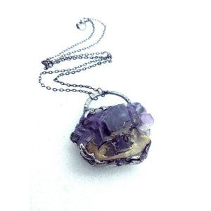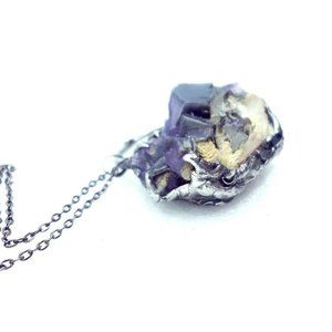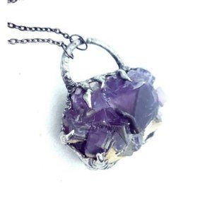 An amazing statement piece crafted from a purple raw flourite geode specimen with octohedral facets. This very unique specimen of purple cubed flourite was then crafted into a beautiful renaissance / medieval pendant, hung from an 18" gunmetal chain.
