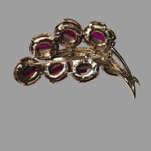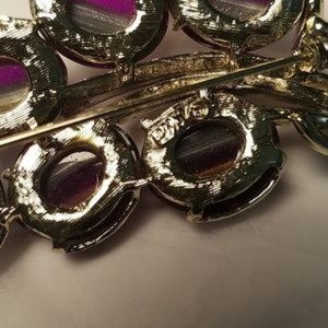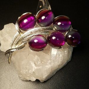 Fabulous vintage Coro brooch in silver tone metal set with amazing purple art glass cabochons. Each translucent stone has a stripe of white on one side with gold and red highlights on the other. The colors shift and change as you move the brooch. The brooch measures 3 by 11/2" and is signed with the Coro Pegasus mark.