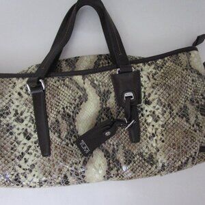 Brown/beige shiny embossed faux leather exotic snakeskin python tote bag by Tumi, manufacturer of high end suitcases and bags for travel.