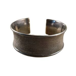 This is a beautiful solid silver, wide cuff bracelet with floral accents on the side. The lovely bracelet could go Victorian in style from the floral details or could be paired with Southwestern pieces easily! The front of the bracelet is several thin ropes of sterling and the edges of the cuff have a cute scalloped pattern with a flower in the center. It is stamped 925.