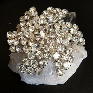Fabulous 1950's Glam brooch! A pinwheel of clear prong set chaton rhinestones is accented with large marquise stones which rotate at an angle around the large center stone. The brooch has a domed profile and sparkles like mad! The rhodium plated setting is in excellent condition. Unsigned and measures 3 1/4".