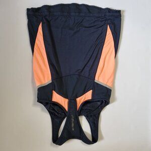 Arena Halter Swimsuit : One-piece performance swimsuit with a blue and pink geometric pattern and open back design. Appears to be a Small/Medium.