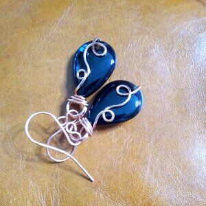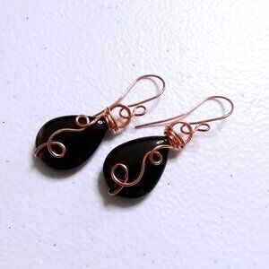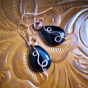 These are substantial Black Agate Teardrops, that I wire wrapped with bright copper jewelry wire and created matching earhooks to go with the wire wrapped design elements. This is a heavier pair of stone earrings - that will look beautiful and be absolutely noticeable, no matter your hair color or how long your hair is. This pair of statement earrings will do double duty with it's esoteric properties and look pretty at the same time! Perfectly suitable for a variety of clothing styles and occasions!