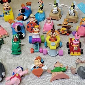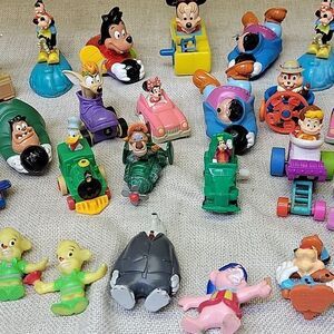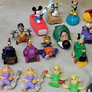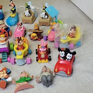 This is a great bundle of small Disney cars, planes, vehicles and more. They include characters such as Mickey Minnie, Goofy, Pluto, Donald and more. Check out the pictures to see all that are included.