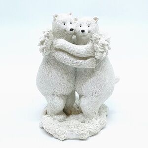 A unique Valentine gift! This Sia Collection figurine features a polar bear angel couple in a loving embrace with a stunning iridescent glitter finish. The pictures don't pick up just how beautiful this sparkles! They're so sweet holding each other cheek to cheek. Standing at 4 inches tall, this small figurine is perfect for adding a touch of romantic whimsy to your decor.