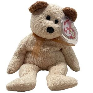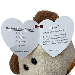 RARE RETIRED Ty Beanie Baby named Huggy the Bear, released in 2000. Huggy is a plush toy with a cream-colored body, brown ears, black eyes and nose, and a light brown ribbon tied around its neck. It has a Ty tag attached to its ear, indicating its authenticity and the year of production. Huggy was introduced on July 8, 2000, and retired on June 18, 2001. It is made of soft, suede-like material and filled with PE pellets. Huggy is considered a collectible item and can be found in both new and used condition, often with its original tags.
