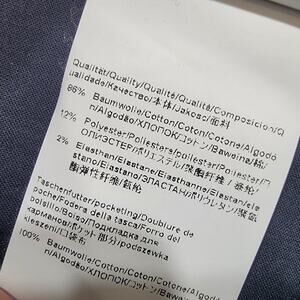 86% cotton 12% polyester 2% elastane. Very nice condition. Measures 17" waist 28" inseam and 38" from waistline to hem. Nonsmoking home with awesome pugs and a crazy bulldog.