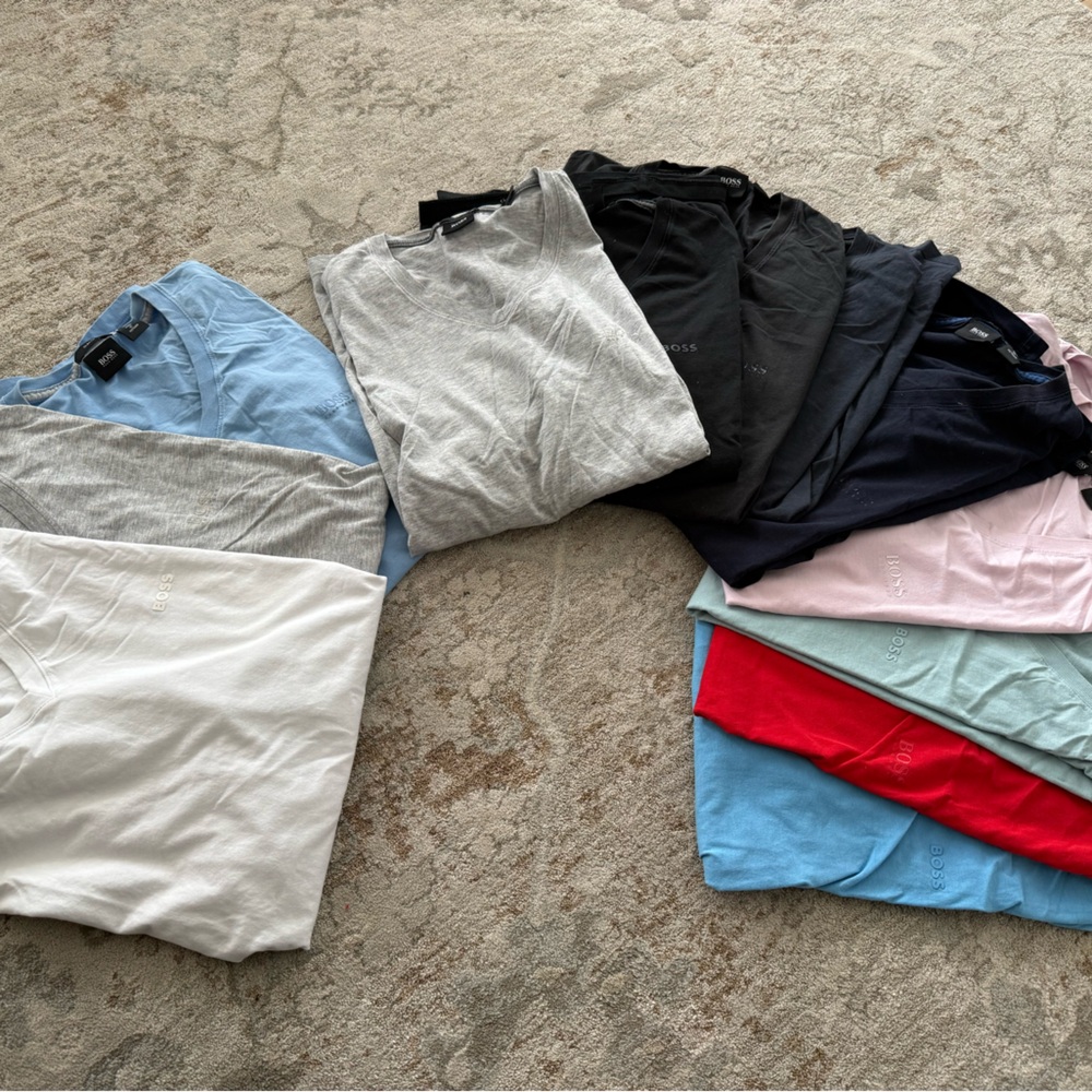 Hugo boss mens Bundle of assorted t-shirts in various colors including white, gray, blue, red, and black. 12. The white gray and light blue t shirts are a size all. The rest are a size large . Majority of the being in very good condition . Slim fit . These retail $40+ each