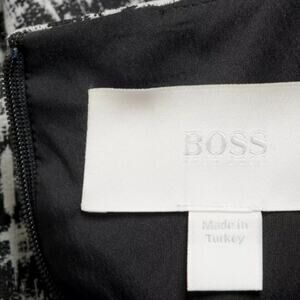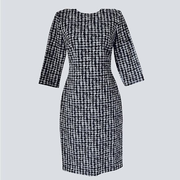 The concealed back zip closure ensures a seamless and elegant look. The dress is adorned with an eye-catching houndstooth pattern, adding a contemporary twist to its timeless charm.