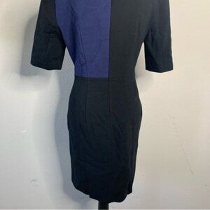 This sophisticated colorblock sheath dress is a striking choice for both professional and social occasions. Featuring a sleek, tailored silhouette, it is designed to flatter the figure with its clean lines and modern aesthetic. The dress showcases a bold colorblock pattern with contrasting panels of black, navy blue, and burgundy, creating a dynamic visual effect that elongates the body. It has a round neckline and elbow-length sleeves, offering a modest yet elegant touch. The back of the dress continues the colorblock design with a navy panel and a concealed zipper closure for a seamless finish.