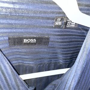 This mens blue striped Hugo Boss dress shirt is in great shape! This item comes in a size Large Armpit to armpit is 25 Armpit to sleeve is 21 Back of collar to hem is 34 Thanks for looking at our item!