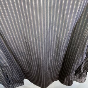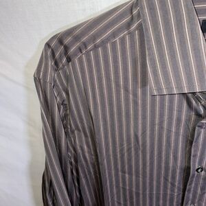 This mens gray striped Hugo Boss dress shirt is in great shape! This item comes in a size Large Armpit to armpit is 24 Armpit to sleeve is 20 Back of collar to hem is 33 Thanks for looking at our item!