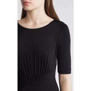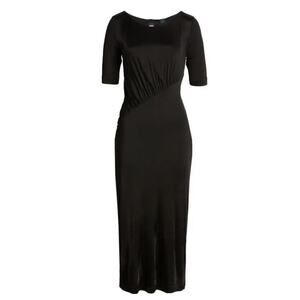 Subtle gathering creates an asymmetric effect on a versatile midi dress with a scoop neck and short sleeves.