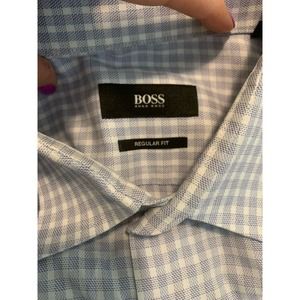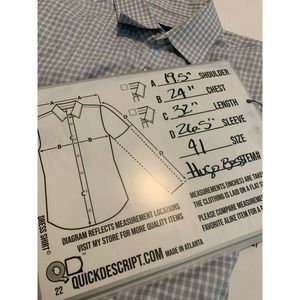 This is a very nice pre-owned Hugo Boss Light Blue Gingham Button Down Long Sleeve Shirt in Size 41 US (L). Please see the second pic for the measurements.