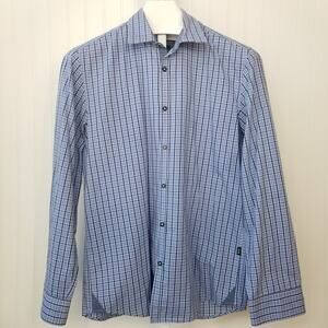Boss Hugo Boss gently used, no holes tears or stains. Long sleeve button down dress shirt, blue checkered pattern.