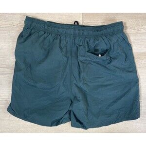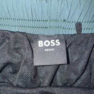 This product is a pair of Hugo Boss men's dark green swim shorts in size large, made of lightweight polyester material. The shorts feature a solid pattern, a comfortable drawstring waist, and pockets for convenience. With a beach and streetwear theme, these swim shorts are perfect for various water activities such as training, water polo, surfing, and recreation. The gray color and logo detailing add a stylish touch to this practical and high-quality swim bottom from the renowned brand Hugo Boss.