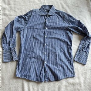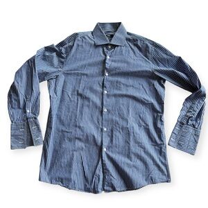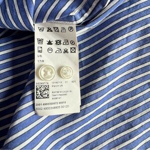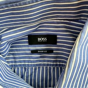 Hugo Boss Men’s Dress Shirt. Color Blue / White Striped. Size 17R. Pit to pit 23”. Length 31.5”. Pre-owned. Great condition. Drycleaned.