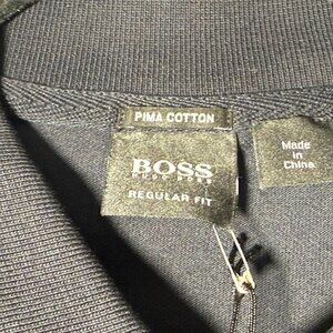 Hugo Boss polo shirt. The shirt is a Dark Navy Blue almost Black , with a two -button placket and short sleeves. It is a men's polo shirt, and the tags indicate it is a new item from the BOSS line of Hugo Boss.