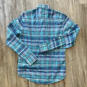 Upgrade your wardrobe with this Hugo Boss men's casual shirt in a vibrant turquoise blue and white plaid. Crafted from lightweight, breathable cotton, this shirt offers a comfortable fit perfect for warmer days. It features long sleeves, a button-front closure, and a classic collar. Size Small. A stylish and versatile addition for work or weekend wear.
