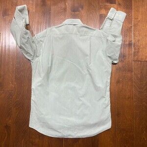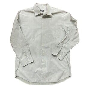 This classic Hugo Boss dress shirt is a pre-owned item, crafted from soft cotton in light gray with microstripes. This size large shirt features long sleeves and traditional button down closure, making it perfect for smart, professional attire.