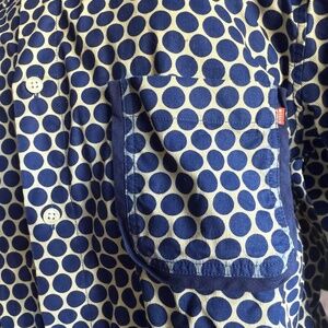 Additional Details: Classic button-up style with playful polka dot pattern Unique pocket detail adds interest Long sleeves with button cuffs Lightweight and versatile for work or casual outings