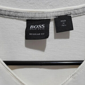 Hugo Boss Regular Fit V neck tee in pre-owned excellent conditions, see pictures for measurements. Has a small smudge on the front. Color is like an off white/cream.