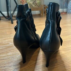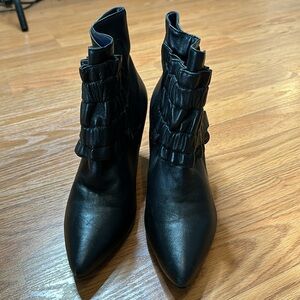 These vintage Hugo Boss boots are the perfect staple! This bootie has a ruffle leather detailing that snaps. The ruffle can be worn open to display a deep blue which also adorns the bottom of the boot. Super cute especially with boots or shorts! Runs small.