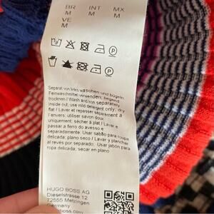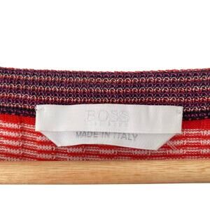 Hugo Boss Ruffled Hem Sleeve Stripe Knit Stretchy Sweater size medium Red Blue in excellent condition. Measurements laying flat chest 18 inches across and length 22 inches long