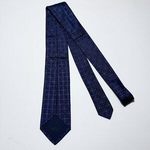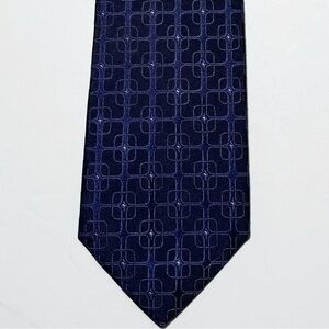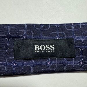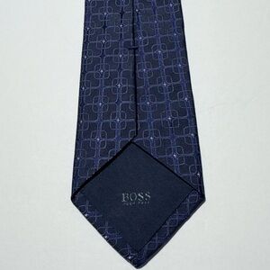 Boss Hugo Boss silk tie. Navy blue with geometric design. Excellent used condition. Length 59”, width 3”. Dry clean only.