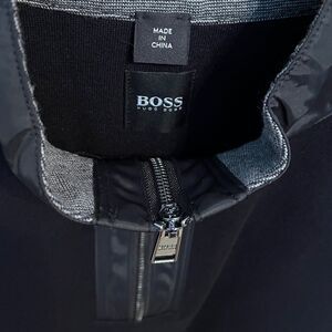 Hugo Boss Sydney Quarter Zip Black Cotton Blend Pullover. with a nylon feeling trim at neckline and shoulders. Excellent preowned condition.