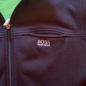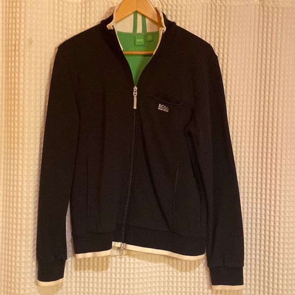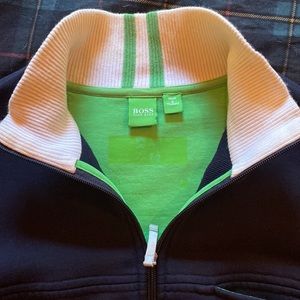 Comfortable yet stylish Hugo Boss track jacket. Navy blue with contrasting green and white accents on the neck and cuff. Lightweight but warm. In near new condition. Hardly worn.