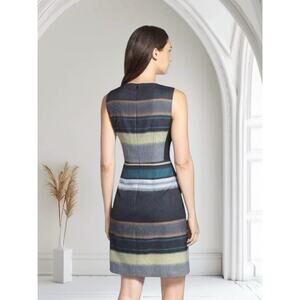 Elevate your wardrobe with the sophisticated charm of a Boss Hugo Boss sleeveless dress. The timeless striped pattern in green, gray , brown and chartreuse hues offers a versatile style that seamlessly transitions from work to weddings. Crafted from a blend of polyester, elastane, and wool, this knee-length fitted dress promises both comfort and durability. It has nice seaming on the bodice and skirt for interest. The crew neck design adds a touch of class, making it an ideal choice for formal occasions and business settings.