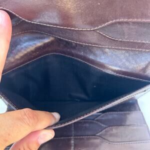 This Hugo Boss vintage tri-fold wallet brings timeless elegance with a bold croc-embossed leather finish. Crafted in a deep brown hue, it’s accented with a signature front buckle strap, giving it a refined yet distinctive look. The structured billfold design includes a zippered interior pocket and organized compartments, making it both stylish and functional. A versatile piece that can be carried as a wallet or a clutch, perfect for collectors of designer vintage leather goods.
