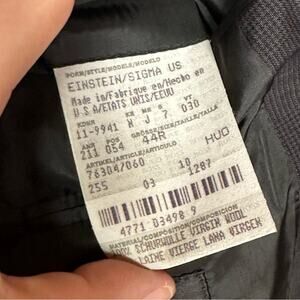 Item in Excellent Vintage Condition, Men's Suit Jacket / Blazer, "Einstein / Sigma" Style Code, 100% Virgin Wool, Super 100s, Made in The USA, 3 Button Closure, 4 button sleeve, Unvented, Notched Collar, Single breast pocket, Charcoal with bright blue threads wovwn into pattern sparingly. PLEASE SEE ALL PHOTOS. Measurements taken laying flat: