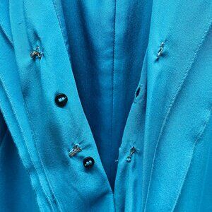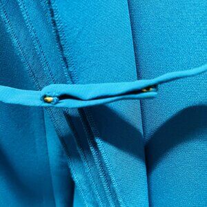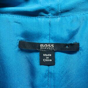 Great Condition. This item does need dry cleaned due to armpit "sweat" stains. Elevate your wardrobe with the chic elegance of the Hugo Boss Women's Damella Silk Dress. This knee-length sheath dress in a stunning teal blue hue is perfect for a variety of occasions, from cocktail parties to weddings. Its sleek V-neck design and sleeveless cut make it a versatile choice for the fashion-conscious woman. The dress is crafted from luxurious silk fabric, ensuring both comfort and style. Delicate ruffles add a touch of femininity, while the belted waist cinches for a flattering silhouette. The dress is easy to care for with its dry clean only requirement, ensuring that it remains a timeless piece in your collection.