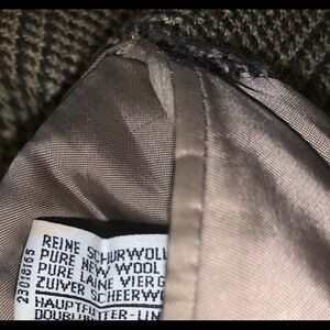 Hugo Boss Houndstooth Wool Blazer. Brown and warm tan houndstooth blazer. Two button closure. Side pockets with flaps. Left chest and inner pockets. Long sleeve with button design. Fully lined. Pure wool. Size: 42L. Preowned in good condition.