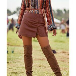 Elevate your wardrobe with this trendy brown faux leather mini skirt. Its A-line silhouette offers a flattering fit, making it a stylish choice for various occasions. Pair it with your favorite tops and accessories for an effortlessly chic look.