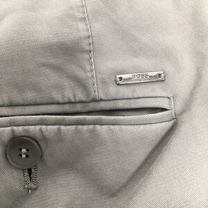 Two pockets on the hips with a small coin pocket on the right of the waistband and two button fastening jetted pockets on the reverse. The dark metal signature HUGO BOSS logo tag is situated above the reverse right pocket.