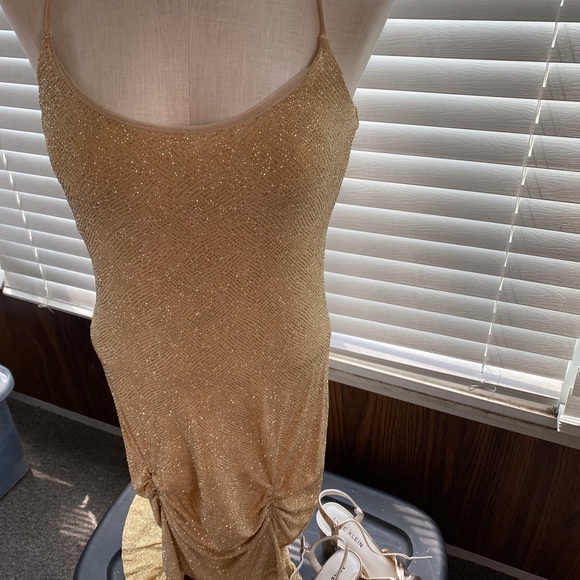 Strapped back, ruched bottom midi dress with bra built-in. This lightweight stretch is the perfect dress for a dance, whether it’s for night out with the girls or on the arm of your significant other- you will be golden.