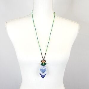 Handmade necklace with rainbow hues features a cute lady with outstretched hands. Created by the Huichol people of the Sierra Madre Mountains. Purchased in Puerto Vallarta directly from the artisan. The lady measures approximately 1.25" x 3" and the necklace is 16.5" long (including lady).