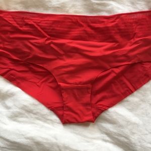 BRAND NEW AND NEVER WORN. Huit Sans Detour Red Satin Seamless Brief with sheer striped motif along waistband and laser cut edges for a seamless look under clothing. Lightweight and comfortable for everyday wear. Machine wash cold and line dry.
