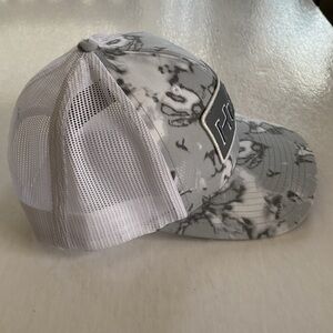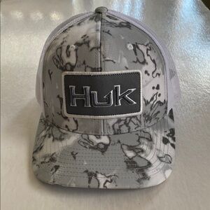 This stylish Huk hat features a structured snapback design with a flat brim, showcasing a unique gray and white camouflage pattern. The front displays a prominent Huk logo patch, adding a touch of brand distinction. Perfect for outdoor activities, this hat combines functionality with a modern urban aesthetic.