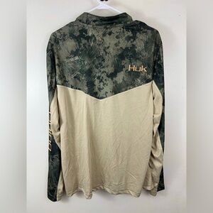 Huk Icon X Camo 1/4 Zip Shirt Mens Size Large in Subphantis Glacier - a Green Tan. Features long sleeves, +30 UPF sun blocking, polyester spandex fabric blend.