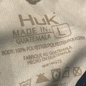 Branding: Printed Huk neck label; Huk logo patch at sleeve hem