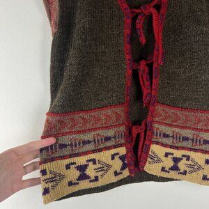 Huk-A-Poo Vintage 70s Acrylic Knit Tie Front Sweater Vest. Aztec southwestern vibes. Boho, festival. Made in Taiwan R.O.C. 100% acrylic. Size Large. Armpit to armpit: 16.5". Length: 22.5". (975)