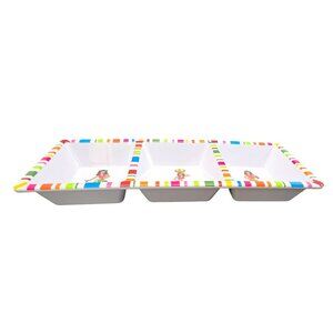 This divided serving tray features vibrant hula girl illustrations with a colorful striped border, offering a playful yet functional design. Ideal for serving a variety of appetizers or snacks, this tray adds a touch of fun and whimsy to any gathering. Its durable melamine material ensures long-lasting use.