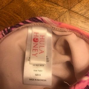 Really cute and kind of edgy , ties up the side. There is a pink feather pattern on a coral background. The ties are black and white snake skin pattern. The front top has darker teal leaves on a lighter teal background. Like new condition. No rips, stains, pilling, pulls, or odors