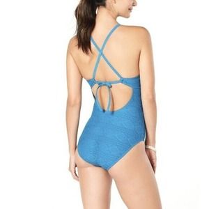 A strappy back and crocheted illusion details give us serious island vibes on Hula Honey's intricate one-piece swimsuit. Removable cups Moderate bottom coverage Pull-on styling; adjustable straps Halter neckline with crisscross and ties at back Lined Shell: polyester/spandex; trim: nylon/spandex; lining: all polyester Machine washable